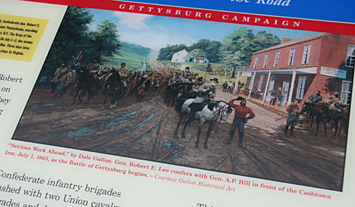 During the time of the Gettysburg campaign of 1863, Confederate General A.P. Hill picked the Cashtown Inn to be his headquarters, moving his 22,000 soldiers into the town and areas around it to camp. It is such a small town, it is hard to imagine where they all stayed. Plus General Lee met with General Hill here in 1863 as depicted by a renowned Civil War artist, Dale Gallon, who painted a rendition of this meeting.