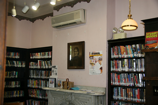 The front door faces south, with a view of the playground. It has the customary Victorian porch. Off the central hallway, to the left is the check-out desk in this parlor, with a lovely fireplace, that has a picture of Amanda Bayne Balph hanging on the wall above it. The parlor on the right also has a lovely fireplace, with a picture of Andrew Bayne hanging on the wall above. Victorian windows are large and the decor suggests that this was a beautiful home when the Balphs lived here.