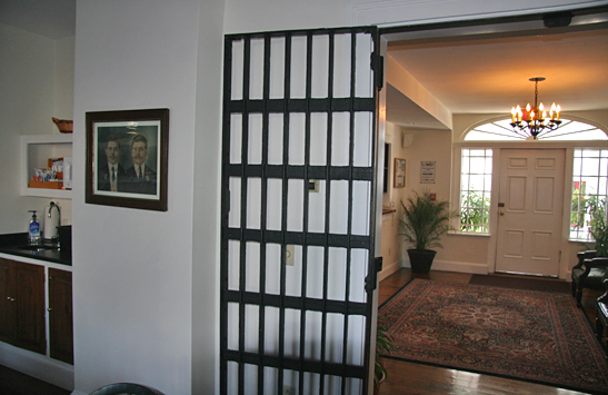 As the visitor enters the front door, there is the old police check in area window, that is now the check in to the inn. The old sign that hangs on the wall lists the various areas of business that one would find in The Newport Police Headquarters, besides the jail, including: Accidents, Complaints, Parking Tickets, and Licenses.