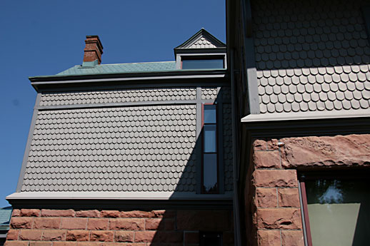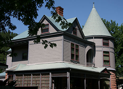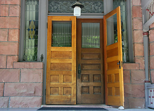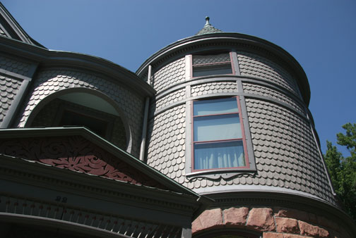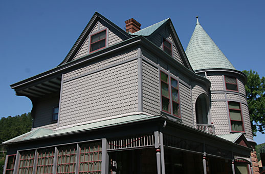 Queen Anne style mansions are described by architectural historian, John C. Poppelier, as being “a contrast of materials”, and so was the Franklin’s new home. The first floor was made of quarried red sandstone, brought by train from Buffalo Gap, South Dakota. The rest of the home was covered in metallic shingles, complete with a corner turret and dome on the third floor /attic, used as a smoking room for visiting gentlemen guests. The interior of the home had 10 rooms. First floor was finished in natural oak and the balance in pine. This mansion had central heat, indoor plumbing, hot and cold running water, electrical lighting, wall-to-wall carpeting, and telephone service.