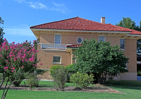 In 1928, the cypress sidings were replaced with buff brick veneer and the exterior cypress columns were replaced with brick columns. The shake roof was replaced with clay tile. The porch on the south side was enclosed, and a sunroom was added.