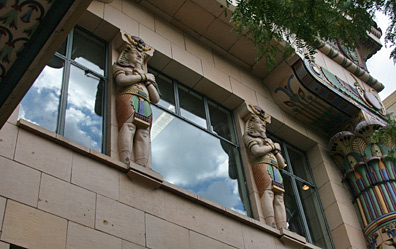The decor is Egyptian-inspired; the full sports package, with intricate motifs, statues outside and inside. There is no mistaking it and is easy to spot. The artisans who created all the Egyptian art designs studied real hieroglyphics, and ancient Egypt statues. They added a few new ones of their own. One depicts one of the Peery brothers leaning on a post, drunk. This brother thought it was hilarious, and it stayed.