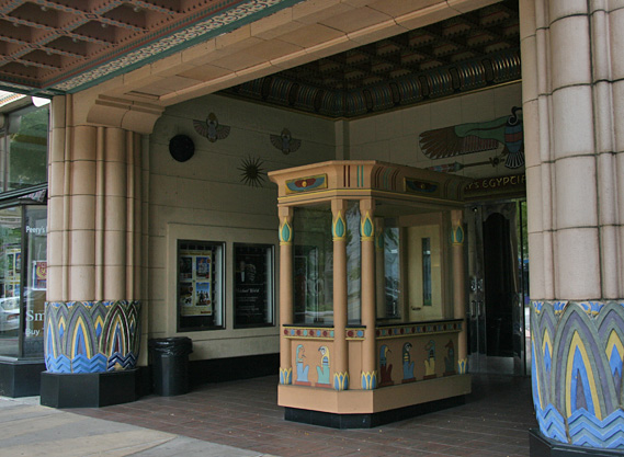 The outside of Peery’s Egyptian Theater has its traditional ornate terra cotta facade, with all the original colors and Egyptian details and decor that stands out on Washington Blvd.