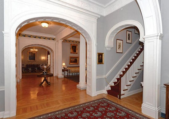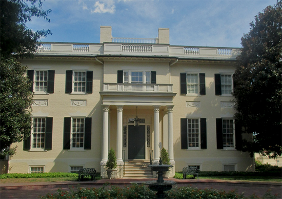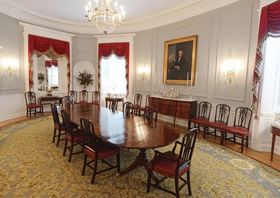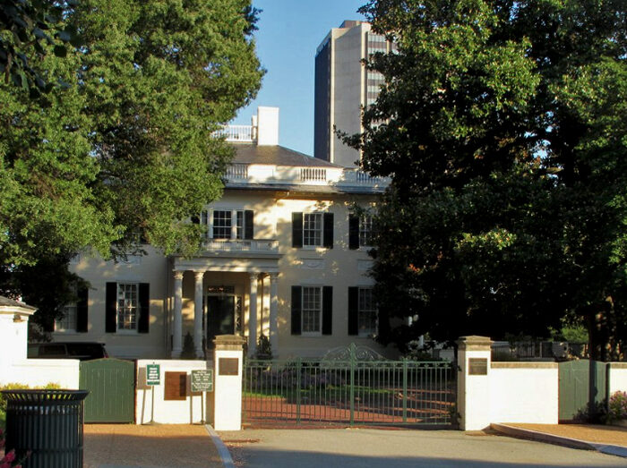 As with most homes that have been around awhile, various governors have made improvements, but the home still has some of its Federalist decor. “The center-hall Governor’s Mansion is in the Federal style. A hipped roof and a balustrade that connects the four chimneys distinguish the two-story painted brick residence. The building has a slightly projecting center bay where a four columned portico in the “Tower of the Winds” Corinthian order creates a monumental entrance to the building. The façade is ornamented with decorative panels of garlands and swags.”