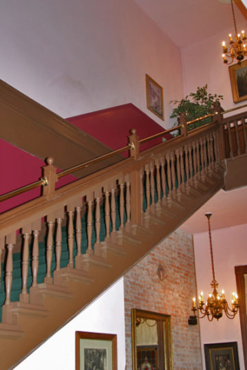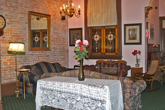 The nineteen guest rooms and suites are “uniquely furnished” with antiques and Victorian decor, with most of them having a private bathroom. They have fourteen to fifteen foot ceilings, “Soaring windows” with some rooms having kitchenettes. Some of the rooms have stained-glass skylights.