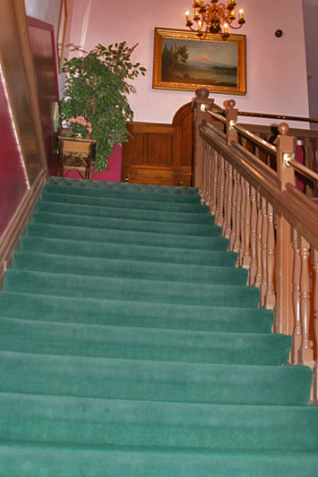Since the 1960s, “The Woman in the Blue Dress” is often seen at top of stairs on the 2nd floor level.