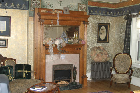 The architectural and artistic treasures are still intact. The original, hand-carved fireplaces in the dining room and parlor are in fine shape. The brick fireplace in the library was restored. The windows in the dining room are made of beveled glass. Two interior doors and the two large pocket doors on the first floor all have beveled glass. The small side windows on either side of the door, which opens into the foyer, have an intricate pattern of beveled glass, perhaps designed by the fellow mentioned below.