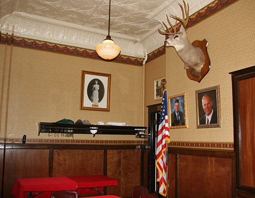 On the outside of first floor that is on 12th street, there is a fine, wide covered porch that provides ample room to sit and watch the people go by. The side entrance brings the guest into the dining room. The front entrance leads to the hotel bed and breakfast. The left side entrance leads into the old dining room, that is used for a variety of things. There are long mirrors on the walls.